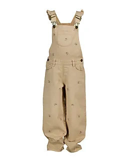 Diese beigefarbene Denim-Hose mit Trägern hat dezente kleine Motive, wodurch sie einen verspielten Look bekommt. Die Träger lassen sich mit Metallschnallen verstellen, sodass du die Passform leicht regulieren kannst. Durch den festen Denim-Stoff fühlt sich die Hose robust an, wodurch du dich an aktiven Tagen frei bewegen kannst.