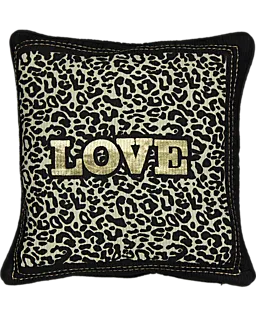 Dieser Kissenbezug ist aus Baumwolle gefertigt und hat ein auffälliges Leopardenmuster mit dem Wort 'LOVE' in goldenen Buchstaben. Der dunkle Rand rundherum sorgt für einen sauberen Abschluss. Der Bezug ist 40 mal 40 Zentimeter groß und passt auf ein Standardkissen. Der Druck setzt einen fröhlichen Akzent in der Einrichtung und lässt sich gut kombinieren.