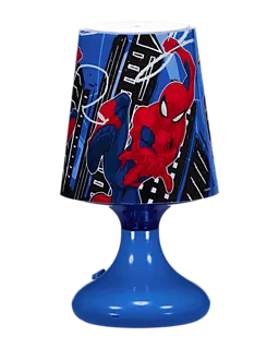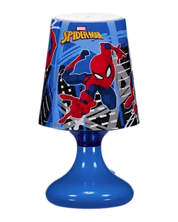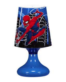 Nachtlampe mit auffälligem Spiderman-Motiv und blauem Fuß. Der Lampenschirm zeigt ein deutliches Bild des bekannten Comic-Helden in Aktion vor einem Hintergrund mit Gebäuden. Gibt stimmungsvolles Licht, zum Beispiel auf einem Nachttisch oder im Kinderzimmer. Die Lampe eignet sich als zusätzliche Lichtquelle beim Einschlafen oder beim Lesen. Praktisches und gut erkennbares Design für Fans von Superhelden.
