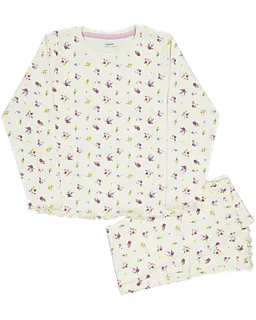 Dieser beige Pyjama für Mädchen hat ein fröhliches Blumenmuster und besteht aus einem Langarmshirt und einer langen Hose. Der weiche, gestrickte Stoff mit Rippstruktur fühlt sich angenehm an, sodass dein Kind gut schlafen oder entspannen kann. Durch den runden Halsausschnitt lässt sich das Shirt einfach anziehen. Der Pyjama eignet sich für kühlere Nächte oder entspannte Momente zu Hause.