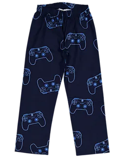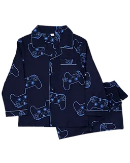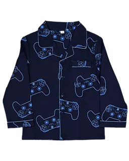 Dieser blaue Jungenpyjama besteht aus 100% Baumwolle mit einem weichen Flanellstoff. Das Oberteil hat lange Ärmel, einen Kragen und wird vorne mit Knöpfen geschlossen. Der Pyjama ist mit einem Druck mit Spielkonsolen-Controllern versehen. Durch den bequemen Stoff eignet sich dieser Pyjama zum Schlafen oder zum gemütlichen Tragen zu Hause.