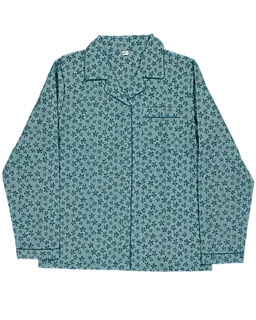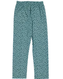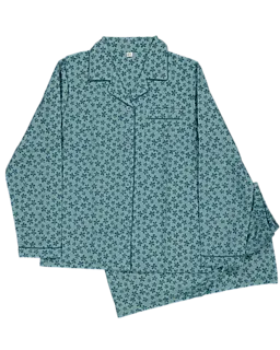 Dieser grüne Mädchenpyjama besteht aus 100% Baumwollflanell und setzt sich aus einem langärmeligen Oberteil und einer langen Hose zusammen. Der Stoff hat ein durchgehendes Blumenmuster und fühlt sich weich an. Das Oberteil schließt mit Knöpfen und hat einen Kragen sowie eine Brusttasche. Der Pyjama ist bequem für die Nacht und lässt sich leicht an- und ausziehen.