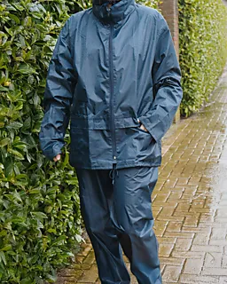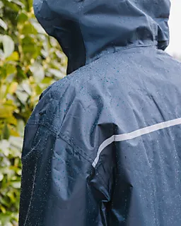 Diese blaue Regenjacke für Herren ist aus Polyester gemacht. Dadurch fühlt sie sich leicht an und trocknet nach einem Regenschauer schnell wieder. Die Jacke hat eine Kapuze und einen Reißverschluss vorne, damit du sie einfach anziehen kannst und gut vor Regen geschützt bist. Mit den Kordeln unten kannst du die Jacke enger machen, damit Wind weniger leicht hineinweht.