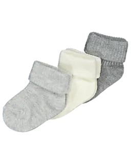 Dieses Set mit 3 Socken für Babys gibt es in Hellgrau, Weiß und Dunkelgrau. Sie bestehen aus einer weichen Mischung aus Baumwolle, Polyester und Elasthan. Die Socken sind leicht dehnbar und haben einen umgeschlagenen Bund, sodass sie gut um die Knöchel sitzen und bequem bleiben. Ideal, um die Füße des Babys warm und geschützt zu halten.
