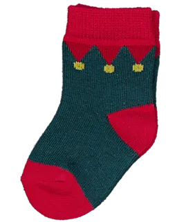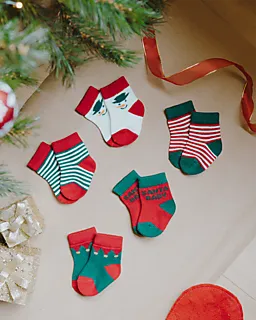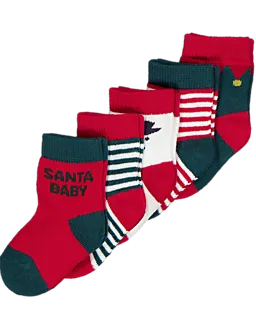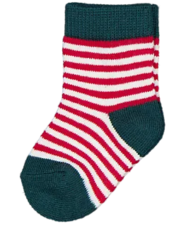 Set aus fünf Paar Babysocken in verschiedenen Rot- und Grüntönen, mit Mustern wie Streifen und Farbflächen. Die Socken sind aus Baumwolle, Polyester und Elasthan gemacht. Das sorgt für eine weiche und bequeme Passform und hält die Füße des Babys an kälteren Tagen warm. Praktisch für den täglichen Gebrauch und einfach mit verschiedenen Outfits zu kombinieren.