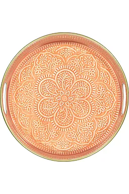 Dieses orangefarbene Tablett hat eine runde Form mit einem dezenten Muster. Durch den erhöhten Rand und die Griffe an der Seite bleibt alles gut liegen, sodass du das Tablett leicht tragen kannst. Zu Hause eignet es sich gut zum Servieren von Getränken oder Snacks. Die warme Farbe lässt deinen Tisch gemütlich wirken.