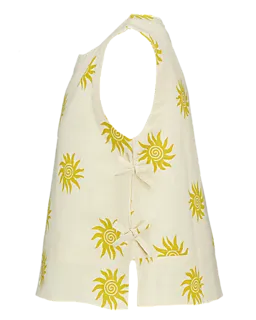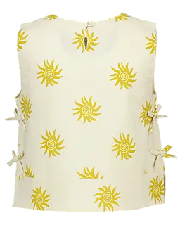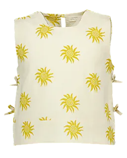 Dieses beigefarbene Top für Mädchen ist aus einem gewebten Stoff gefertigt und hat ein Muster mit gelben Sonnen, wodurch es einen frischen Eindruck macht. An den Seiten gibt es kleine Schleifen, damit sich das Top leicht anziehen lässt und gut sitzt. Der runde Halsausschnitt und die gerade Passform sorgen für bequemen Tragekomfort, sodass du dich frei bewegen kannst.