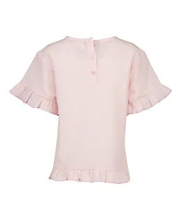 Dieses hellrosa Mädchentop hat kurze Ärmel mit einer auffälligen Volantkante und einem Volant am Saum. So entsteht ein verspielter Effekt. Der runde Halsausschnitt sorgt für eine einfache und bequeme Passform. Der feste, gewebte Stoff fühlt sich angenehm an und sitzt gut, sodass das Top bequem zu tragen ist. Durch die einfarbige Farbe lässt es sich leicht mit einer Hose oder einem Rock kombinieren.