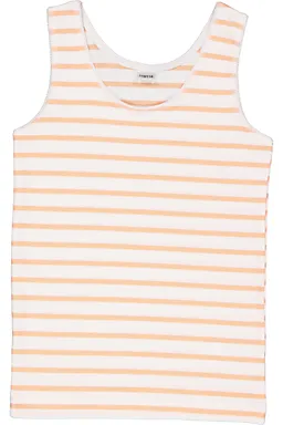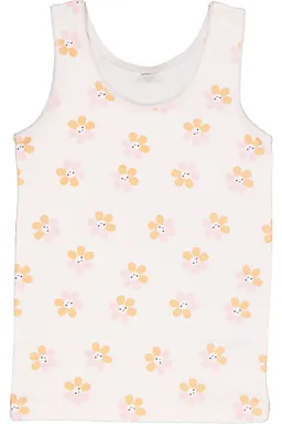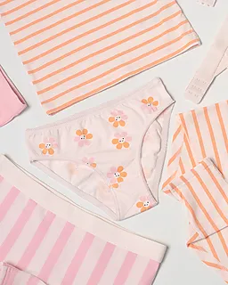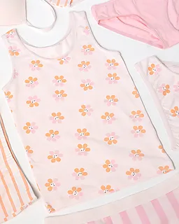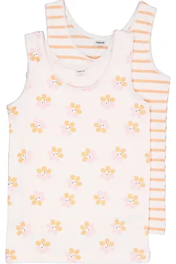 Dieses Set aus zwei Unterhemden für Mädchen besteht aus einem Unterhemd in einem hellrosa Farbton mit einem Druck aus gelben und rosa Blümchen und einem hellrosa Unterhemd mit orange-weißen Streifen. Der Stoff enthält Baumwolle, Polyester und einen kleinen Anteil Elasthan. Dadurch fühlen sich die Unterhemden weich an und dehnen leicht mit. So sitzen sie angenehm und man kann sich gut bewegen.