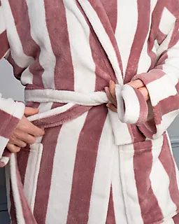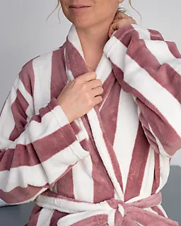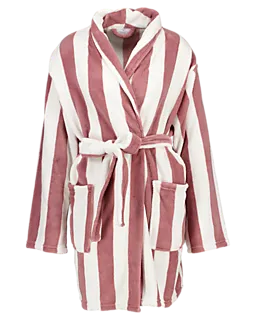 Dieser Bademantel hat breite rosa-weiße Streifen. Hergestellt aus weichem Coral-Fleece, was sich angenehm auf der Haut anfühlt. Der Schalkragen sorgt für zusätzlichen Komfort. Mit Bindegürtel in der Taille und zwei praktischen Taschen an der Vorderseite. Dank des schlichten Designs ist dieser Bademantel praktisch nach dem Duschen oder zum Entspannen zu Hause.