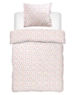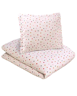 Dieses beige Bettwäscheset mit Herzchenmuster besteht aus einem Bezug und einem passenden Kissenbezug. Das Set hat eine Größe von 135 mal 200 Zentimetern. Das gewebte Material macht den Bezug robust und angenehm im Gebrauch, sodass du gut schlafen kannst. Durch die Kombination mehrerer Farben bekommt dein Schlafzimmer einen fröhlichen Eindruck.