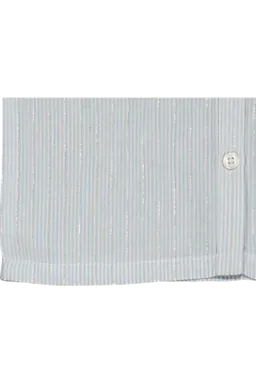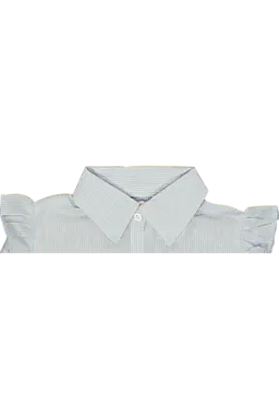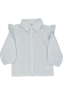 Diese hellblaue Baby-Bluse ist gewebt und hat einen klassischen Kragen mit Knopfleiste vorne. So kann man sie leicht an- und ausziehen. Die Schultern sind mit einem verspielten Rüschen-Detail versehen, das der Bluse eine fröhliche Note gibt. Das luftige Modell eignet sich für warme und kühlere Tage.