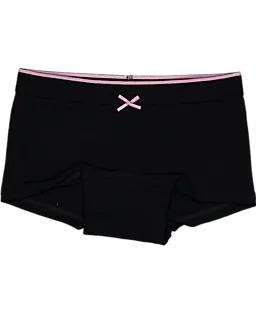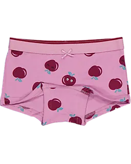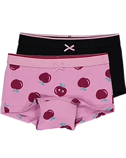 2er-Set Boxershorts für Mädchen. Die eine ist schwarz mit einem hellrosa Schleifchen an der Vorderseite. Die andere ist violett, mit fröhlichem Apfel-Print und einem lachenden Gesicht, ebenfalls mit einem Schleifchen. Aus 95 % Baumwolle und 5 % Elasthan. Der Stoff fühlt sich weich an und ist elastisch, was jeden Tag angenehmen Tragekomfort bietet.