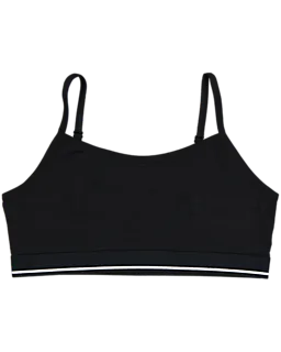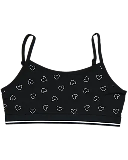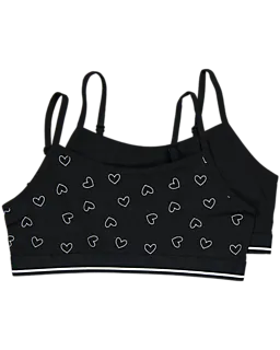 Set mit 2 Claire Croptops für Mädchen. Ein Top ist schwarz mit weißen Herzen, das andere ist einfarbig schwarz. Beide Croptops haben schmale Schulterträger und ein elastisches Band unten. Sie sind aus Baumwolle mit etwas Elasthan gemacht. Dadurch fühlen sie sich weich an und liegen beim Tragen angenehm am Körper.