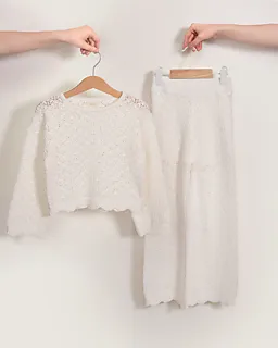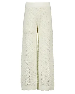 Diese weiße Mädchenhose ist aus Strick gefertigt und hat ein langes, gerades Bein. Der Stoff hat ein durchbrochenes Muster, sodass die Hose luftig ist und sich angenehm anfühlt, wenn es wärmer ist. Durch den elastischen Bund lässt sich die Hose leicht anziehen und sitzt gut. Das weiche Strickmaterial sorgt dafür, dass du dich bequem und frei bewegen kannst.