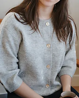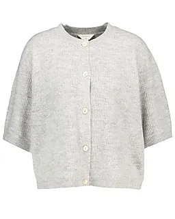Diese graue Damen-Strickjacke hat ein meliertes Muster und halblange Ärmel. Der Stoff besteht teilweise aus recyceltem Acryl und Polyester. Das sorgt für eine feste und zugleich weiche Struktur. Dank des runden Ausschnitts und der großen Knöpfe vorne lässt sich die Strickjacke leicht an- und ausziehen.