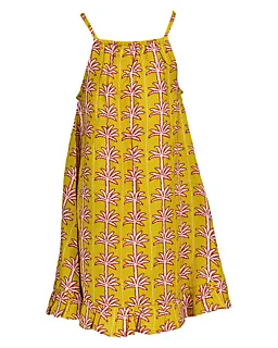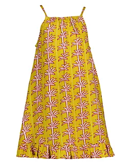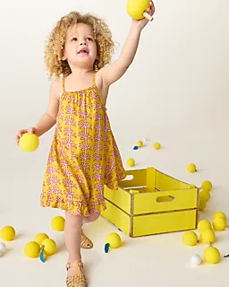 Dieses braune Mädchenkleid hat ein gelbes Muster mit rosafarbenen und weißen palmenartigen Motiven. Das Kleid ist gewebt und ärmellos, sodass man sich gut bewegen kann. Das kurze Modell macht das Kleid luftig, damit man sich auch an warmen Tagen angenehm bewegen kann. Die schmalen Träger und die leichte Raffung am Hals geben dem Kleid einen verspielten Look.