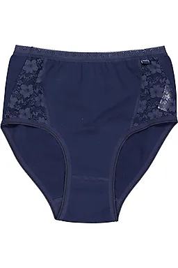 Diese Mady-Taillenslips für Damen kommen im 4er-Set in den Farben Hellblau, Weiß und Dunkelblau. Die Slips sind mit Spitzendetails an den Seiten versehen, wodurch sie einen eleganten Look bekommen. Dank der Baumwolle mit etwas Elasthan fühlt sich der Stoff angenehm an und gibt leicht nach, sodass die Slips bequem an deinem Körper anliegen.