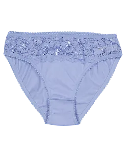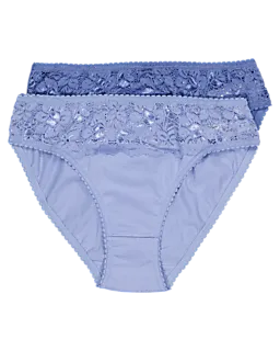 Dieses Set aus zwei Maya-Slips für Damen ist in Violett und Dunkelviolett gehalten. Der weiche Spitzenbesatz am Bund sorgt dafür, dass die Slips gut an der Haut anliegen. Dank der Verwendung von Baumwolle und Elasthan sind sie atmungsaktiv und dehnbar, was für zusätzlichen Komfort unter einer Hose oder einem Rock sorgt.