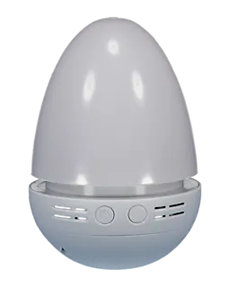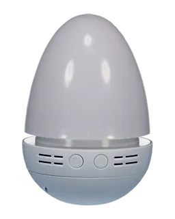 Diese Nachtlampe hat eine eiförmige Form mit einer glatten, glänzenden Oberfläche. An der Vorderseite befinden sich zwei sichtbare Knöpfe und an den Seiten gibt es Belüftungsöffnungen. Durch die kompakte Größe passt die Lampe gut auf einen Nachttisch oder Schreibtisch. Praktisch, wenn man nachts etwas zusätzliches Licht braucht, ohne eine große Lampe einzuschalten.