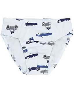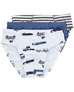 3er-Set Slips für Jungen in verschiedenen blauen Dessins. Einer ist unifarben in Dunkelblau, einer hat blaue und weiße Streifen und einer hat ein blau-weißes Muster mit Autos. Der elastische Bund sorgt für eine gute Passform. Durch den anliegenden Schnitt sitzen die Slips angenehm unter der Hose und sind bei jeder Bewegung bequem.