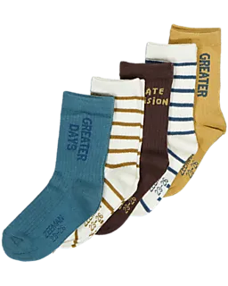 Dieses Set mit fünf Paar Socken ist für Jungen und Mädchen geeignet. Die Socken gibt es in verschiedenen Farben wie Blau, Beige, Braun und Weiß, mit Streifen und Aufschriften wie 'GREATER DAYS' und 'CREATE PASSION'. Durch den weichen Stoff aus Baumwolle, Polyester und Elasthan sitzen sie bequem und passen sich gut an. So hast du immer ein zusätzliches Paar Socken auf Vorrat, damit dir nicht so schnell die Socken ausgehen.