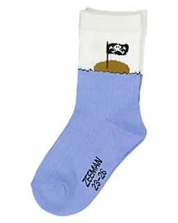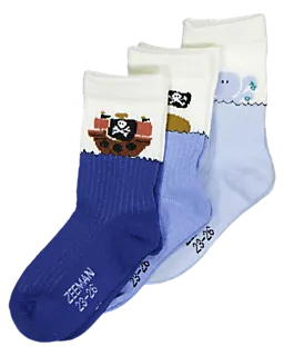 Dieses Set mit 3 Socken für Jungen und Mädchen hat verschiedene Blautöne und fröhliche Motive, wie einen Piraten und einen Wal. Die Socken sind aus Baumwolle, Polyester und Elasthan gemacht. Dadurch fühlen sie sich weich an und sind leicht dehnbar. Die gerippten Bündchen sitzen gut, sodass die Socken beim Tragen an Ort und Stelle bleiben.