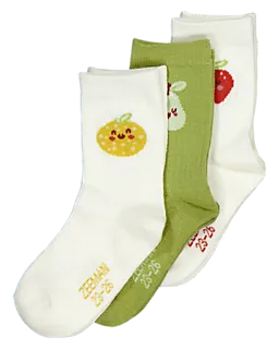 Diese Socken für Jungen und Mädchen kommen im 3er-Pack und sind in Weiß und Grün gehalten. Jedes Paar ist mit einer fröhlichen Fruchtfigur wie einer Zitrone, Birne oder einem Apfel verziert. Das verleiht den Socken eine verspielte Note. Der Baumwollanteil sorgt dafür, dass sie sich weich anfühlen, und der Bund sitzt gut, damit die Socken angenehm bleiben.