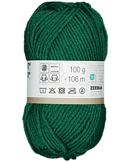 Dieses grüne Strickgarn ist perfekt für verschiedene Häkel- und Strickprojekte. Es besteht aus 90 % Acryl und 10 % Polyester, und ein Knäuel wiegt 100 Gramm. Eine Maschenprobe von 10 x 10 cm zählt 14 Maschen und 18 Reihen. Geeignet für Stricknadeln der Stärke 9–10 und Häkelnadeln der Stärke 7.