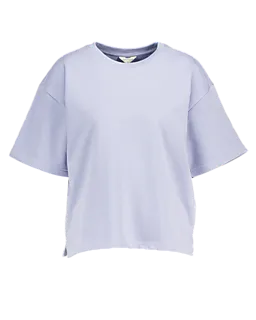 Dieses hellblaue Damen-T-Shirt hat kurze Ärmel, einen Rundhalsausschnitt und eine kastenförmige Passform. Der Stoff ist eine Mischung aus Baumwolle und Polyester, dadurch fühlt sich das T-Shirt weich an und trägt sich angenehm. Durch die lockere Passform kannst du dich gut bewegen und es sitzt bequem. Die einfarbige Optik sorgt dafür, dass du es leicht mit einer Hose oder einem Rock kombinieren kannst.