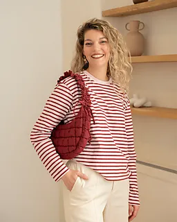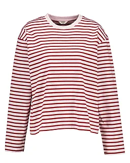 Dieses Damen-T-Shirt hat einen runden Ausschnitt und lange Ärmel, sodass die Arme gut bedeckt sind. Das Shirt hat ein rot-weiß gestreiftes Muster, das ihm eine frische Ausstrahlung gibt. Das Modell besteht aus 100% Baumwolle. Der weiche, atmungsaktive Stoff liegt angenehm auf der Haut, sodass sich das T‑Shirt zu Hause oder unterwegs gut tragen lässt.