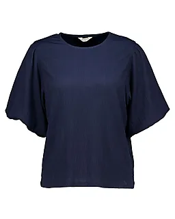 Dieses dunkelblaue Damen‑Top hat einen runden Ausschnitt und weite kurze Ärmel. Dadurch fällt es luftig und trägt sich angenehm an warmen Tagen. Der glatte Stoff aus Polyester mit etwas Elasthan fühlt sich leicht und flexibel an, sodass du dich gut bewegen kannst. Die einfarbige Optik wirkt ruhig und lässt sich einfach kombinieren.