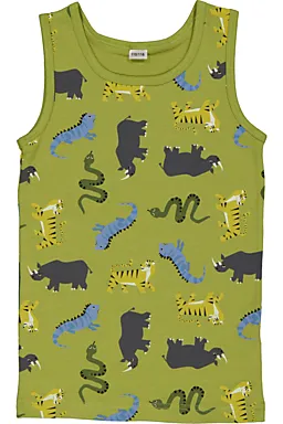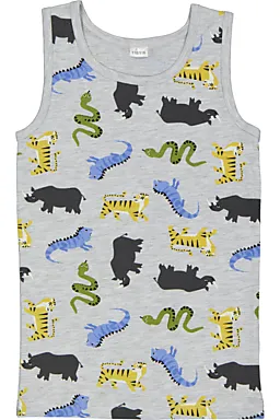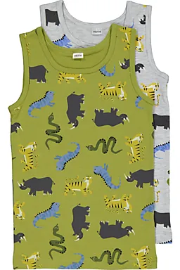 Dieses Set aus zwei Jungenhemden ist in Grün und Grau gefertigt und hat einen auffälligen Tierdruck mit Tigern, Bären, Schlangen und Krokodilen. Der Stoff besteht aus Baumwolle, Polyester und Elasthan. Dadurch fühlt sich das Hemd weich an und dehnt sich angenehm mit. Durch die ärmellose Form trägt sich das Hemd an warmen Tagen luftig.