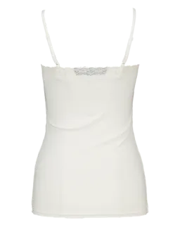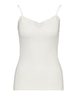 Dieses weiße Damen-Singlet hat schmale Träger und eine dezente Spitzenbordüre am Halsausschnitt. Der gerippte Stoff schmiegt sich angenehm an den Körper an, sodass das Top bequem sitzt. Dank des schlichten Designs lässt sich das Singlet gut unter der Kleidung tragen, ohne aufzufallen. An warmen Tagen lässt es sich auch einfach so tragen.
