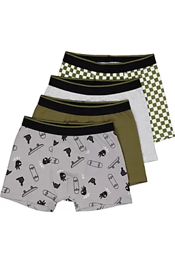 Este pack incluye cuatro bóxers para niño en color gris, verde, blanco y a cuadros blancos y negros, y uno de ellos lleva un divertido estampado de monopatines. El tejido de algodón, poliéster y elastano hace que resulten suaves y agradables al tacto. Su cinturilla elástica hace que se ajusten bien y que sean muy cómodos incluso en pleno movimiento.