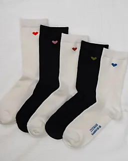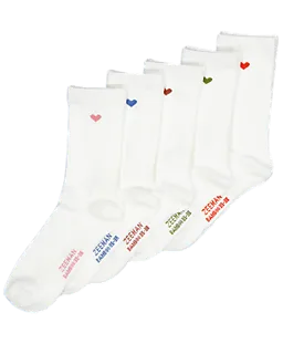 Este set contiene cinco calcetines blancos para mujer, hechos de 70% algodón, 28% poliéster y 2% elastano. Los calcetines tienen un pequeño corazón de color en el lateral. Gracias al tejido suave y elástico, se ajustan bien y resultan cómodos de llevar, ideales para el uso diario.