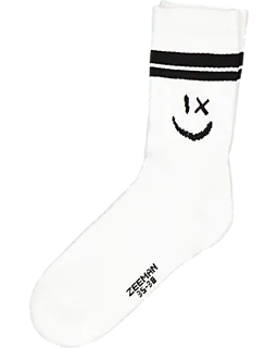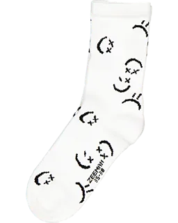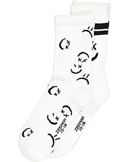 Estos calcetines blancos para mujer están hechos de algodón, poliéster y un poco de elastano, por lo que son suaves y se estiran ligeramente. Los calcetines tienen un llamativo estampado negro con diferentes expresiones faciales y una doble raya negra en la parte superior. Gracias al borde elástico, se ajustan bien alrededor de los tobillos y se mantienen cómodos durante el uso.