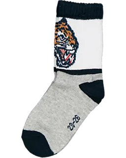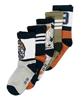 Este juego de cinco pares de calcetines viene en los colores azul oscuro, blanco, verde oliva, gris y naranja. Cada calcetín tiene su propio dibujo, como una cabeza de tigre, rayas o un número. Los puños elásticos se ajustan bien, por lo que los calcetines se mantienen en su sitio. Gracias a la combinación de algodón, poliéster y elastano, los calcetines son suaves y el tejido se estira un poco al usarlos.