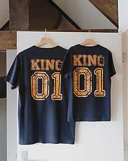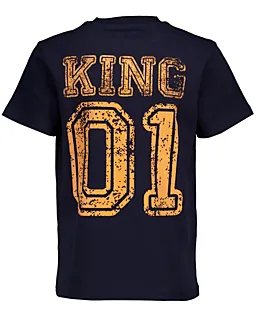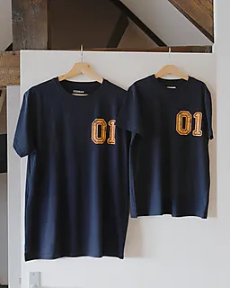 Esta camiseta azul oscuro para niño tiene mangas cortas y un cuello redondo, por lo que se pone fácilmente y resulta cómoda. En el pecho lleva un “01” en amarillo, que le da un toque deportivo. La camiseta está hecha de single jersey, así que la tela cae con soltura y se siente suave sobre la piel.