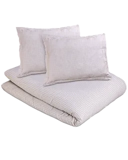 Este juego de funda nórdica de color beige con diseño de cuadros incluye una funda nórdica y dos fundas de almohada a juego. El tejido tiene una textura tejida resistente, por lo que se mantiene bien colocado sobre la cama. Aporta un toque de tranquilidad a tu dormitorio gracias a su color suave y a su diseño sencillo. Con sus medidas de 200 x 200 cm, el juego es apto para una cama doble.