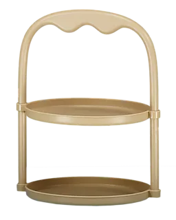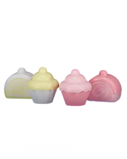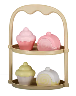 Set de juguetes de plástico con forma de pasteles, compuesta por cuatro tipos diferentes de tartas y pasteles de colores. El set está sobre un soporte beige de dos niveles. Cada pastel tiene su propia forma y color, como rosa, blanco y amarillo. Es una forma divertida de estimular el juego de roles y la imaginación.