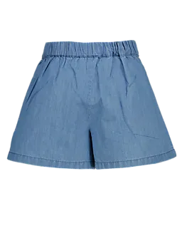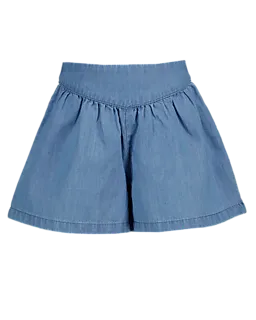 Este short azul para niña está hecho de denim y tiene un largo corto. La cintura es alta, por lo que el short queda bien sujeto y cómodo. La tela cae de manera suelta sobre las piernas, así que puedes moverte fácilmente al jugar. El material liso y resistente aporta comodidad extra. El color liso hace que sea fácil de combinar con otra ropa.