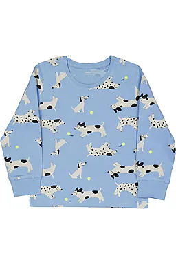 Este pijama azul para niño está hecho de 100% algodón, por lo que la tela se siente suave en la piel. El pijama tiene un cuello redondo, mangas largas y pantalones largos, para que mantengas el calor. El estampado de perros con pelotas amarillas le da un toque alegre. Gracias a la tela flexible, puedes moverte con comodidad mientras duermes.