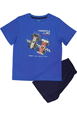 Este pijama azul para niño tiene una camiseta de manga corta y un pantalón corto. La camiseta tiene un cuello redondo y un estampado con dos coches de carreras, junto con el texto ‘Formula Race’ y ‘Ready for the competition’. El single jersey de 100% algodón es suave y transpirable, por lo que duermes cómodo en noches cálidas. El pantalón liso le da un aspecto tranquilo.