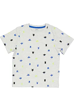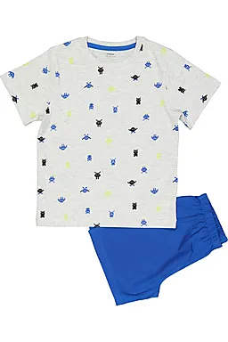 Este pijama corto para niño consiste en una camiseta gris claro con mangas cortas y cuello redondo, estampada con pequeñas figuras azules y negras. El pantalón corto a juego es de color azul liso. El tejido es suave y flexible gracias al algodón con un poco de poliéster, para dormir cómodo y moverse con facilidad. Las mangas cortas y las perneras cortas ayudan a que no tengas demasiado calor.