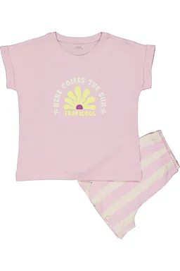 Este pijama corto morado para niñas está hecho de 100% algodón single jersey, lo que hace que la tela sea suave y transpirable. La camiseta tiene mangas cortas y un cuello redondo, para que puedas dormir cómoda. En la parte delantera lleva una flor con el texto ‘Here comes the sun’, que le da un toque alegre. El pantalón corto tiene rayas en lila claro y amarillo claro, para que duermas de forma ligera.