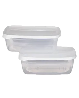 Este set de 2 recipientes blancos tiene forma rectangular y una capacidad de 2 litros por caja. Las cajas miden 23 por 16,5 centímetros y tienen 9,5 centímetros de alto, así que las puedes colocar fácilmente en la nevera o en el armario. Como el material es transparente, ves de un vistazo lo que hay dentro y puedes coger rápido el recipiente adecuado para guardar comidas o sobras.