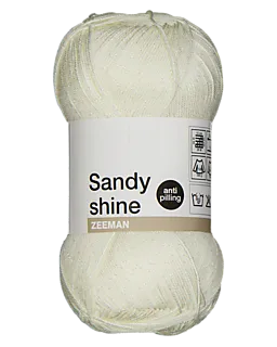 Este hilo de punto Sandy Shine es de color blanco y destaca por su aspecto ligeramente brillante. El ovillo pesa 100 gramos y cuenta con 340 metros de hilo, por lo que un solo ovillo puede rendir mucho en tus proyectos. Para este hilo, se recomienda utilizar agujas de punto de entre 2,5 y 3,5 mm y agujas de ganchillo de 1 a 3 mm. En una muestra de 10 x 10 cm necesitarás unos 26 puntos y 36 hileras.