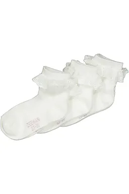 Ces chaussettes blanches pour fille sont faites en coton, polyester et élasthanne. Elles ont un bord ondulé en haut, ce qui les rend douces autour de la cheville et leur permet de bien rester en place. Grâce au mélange de matières, le tissu est extensible et s’adapte bien au pied. Le lot contient trois paires, pour que vous ayez toujours une paire propre sous la main.