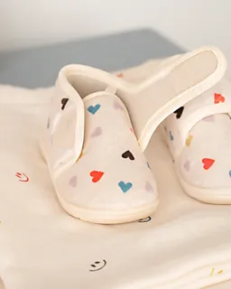 Ces chaussons pour bébé beiges ont de petits cœurs de différentes couleurs, comme le rouge, le bleu et le noir. La fermeture à scratch permet de bien maintenir les chaussons aux pieds, même quand votre bébé bouge. La doublure douce est agréable au toucher, ce qui rend les chaussons confortables. Grâce à leur design joyeux et pratique, ils conviennent aux bébés.